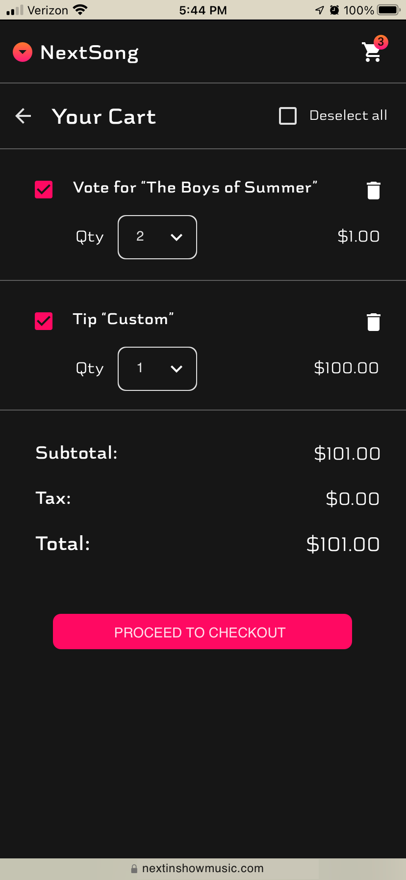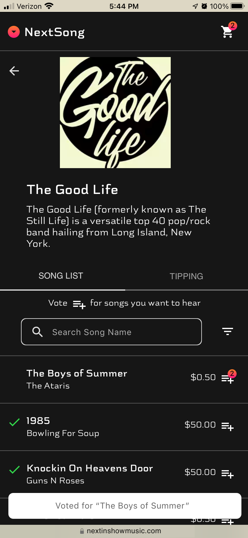Next Song is a mobile app that allows you to curate live concerts by voting on songs to be played at the concert. Users can add tips to votes to increase the likelihood that they will be performed.